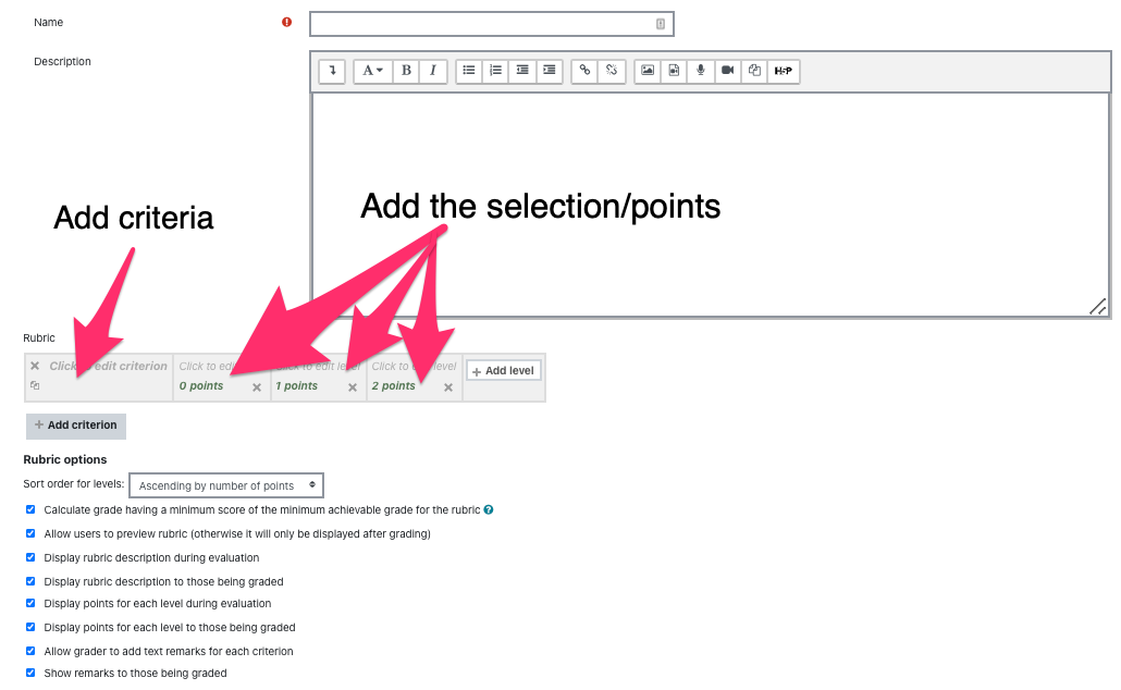 Note: You must start with a level that has a point value of ZERO (eg., scale ranging from 0-3). If you do not include a "0" level, the rubric grade will not calculate correctly.